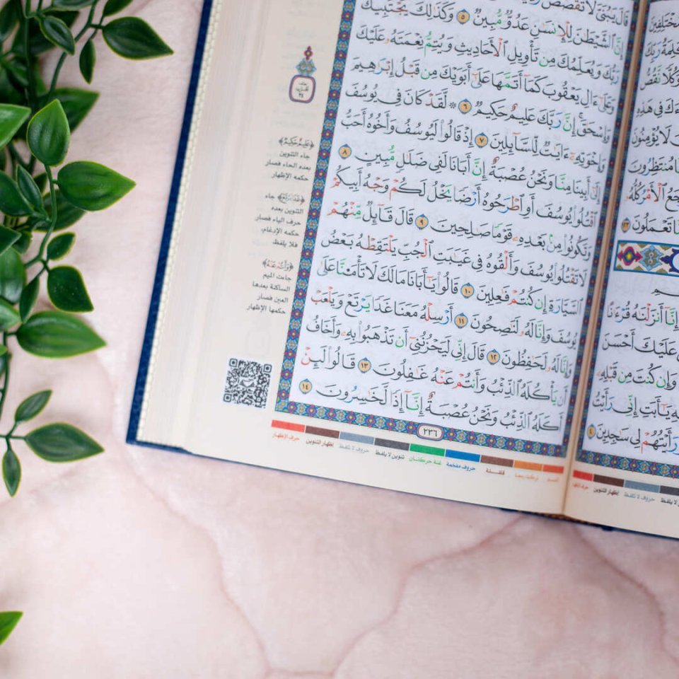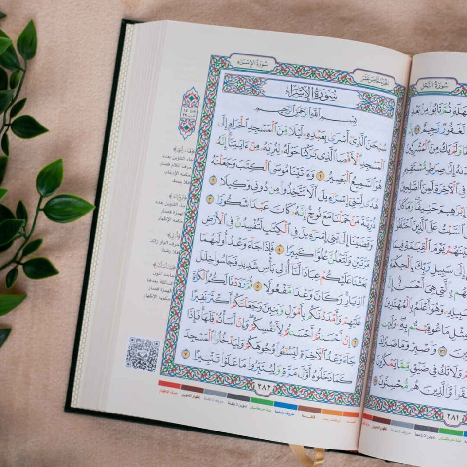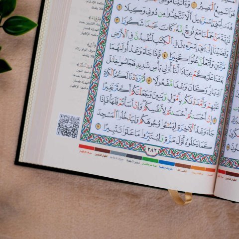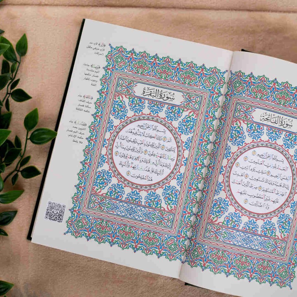 - قواعد التجويد: يتضمن المصحف قواعد تجويد ملونة لضمان النطق الصحيح والتلاوة السليمة للآيات القرآنية.